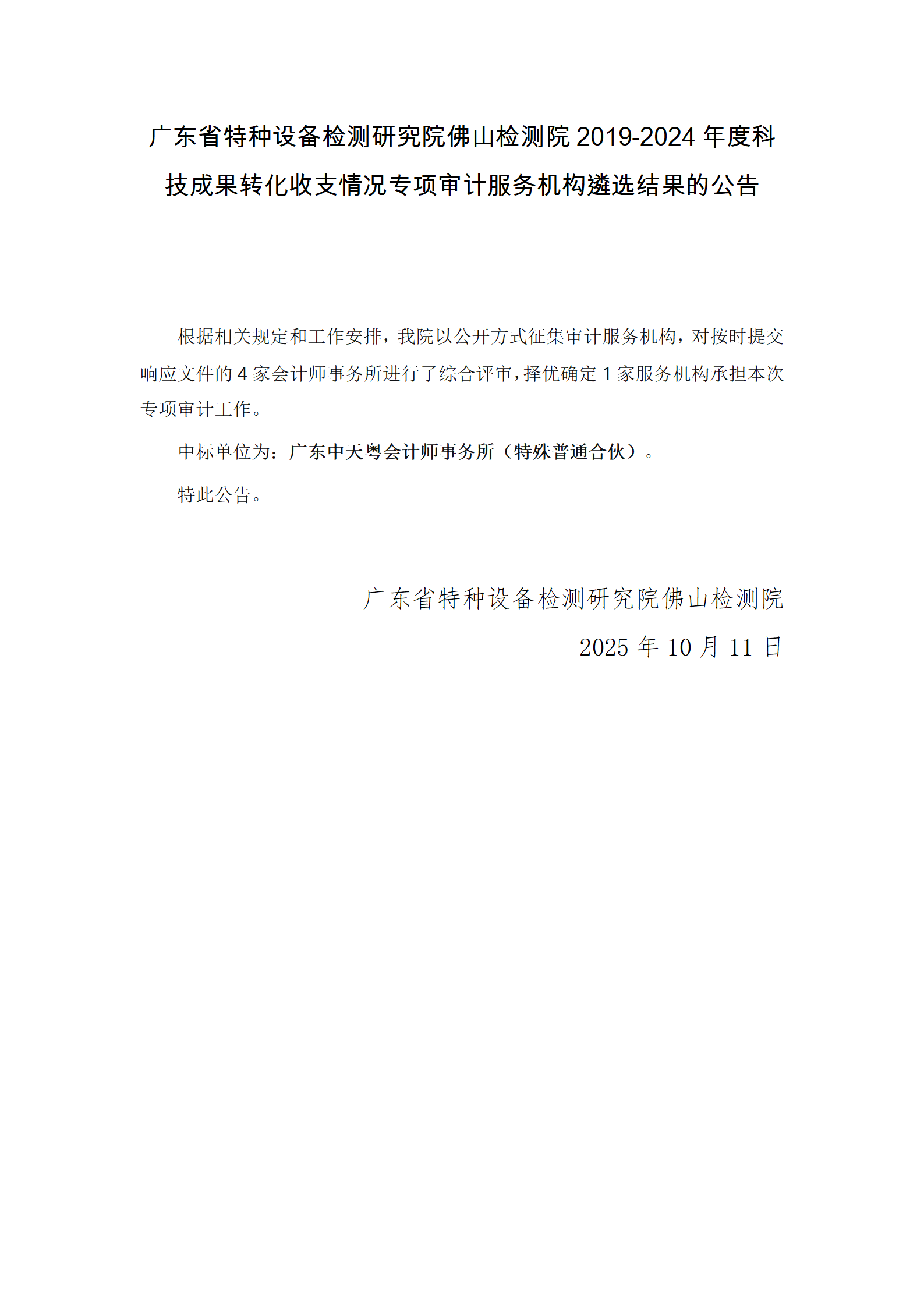 广东省特种设备检测研究院佛山检测院2019-2024年度科技成果转化收支情况专项审计服务机构遴选结果的公告
