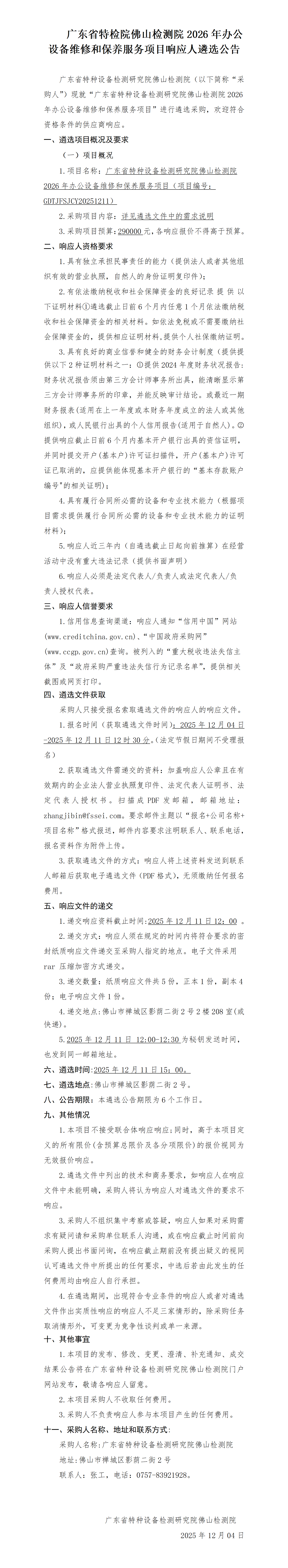 广东省特种设备检测研究院佛山检测院2025~2027年采购代理机构公开遴选公告